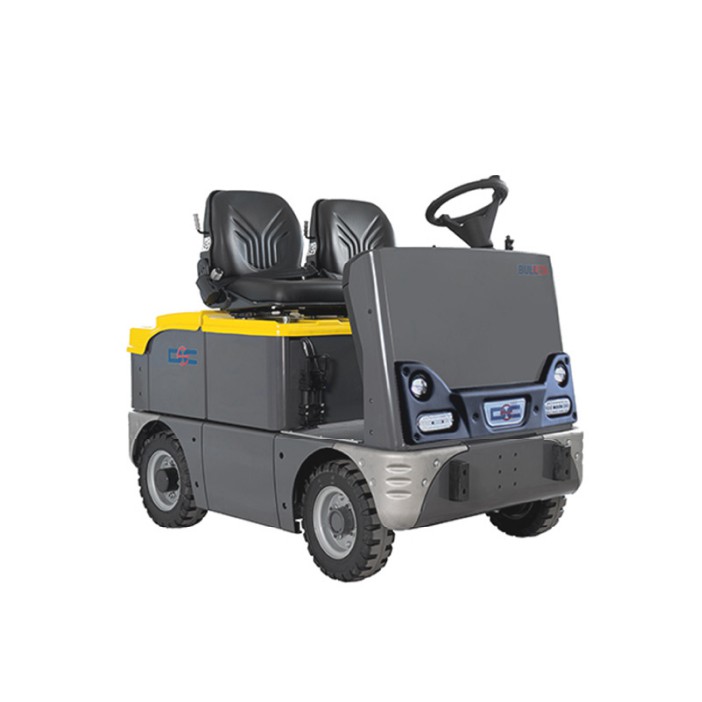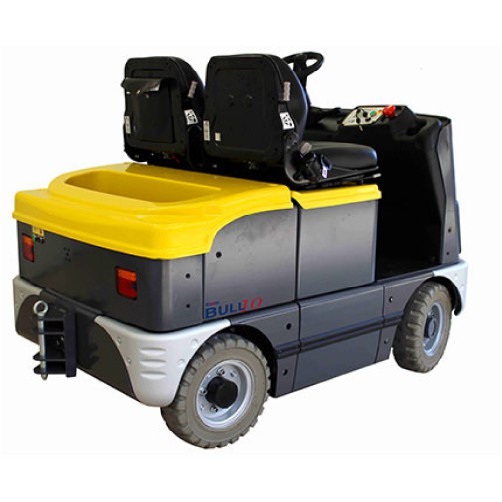 Elektrický tahač pro sedícího řidiče BULL 10 slouží k manipulaci nákladu až do 10 tun. Je vhodný např. pro tažné soupravy. Čtyři kola poskytují tomuto tahači výbornou stabilitu. Kola jsou robustní a hodí se pro vnitřní i venkovní použití. Je k dispozici také se dvěma sedadly. Tahač lze vybavit širokou škálou příslušenství – např. bezp. osvětlení, kabina pro řidiče, stěrače a mnoho dalšího (viz video). S konfigurací stroje Vám rádi pomůžeme. Sedadlo je vybaveno bezpečnostním pásem. Interaktivní displej ukazuje stav baterie, rychlost apod. Tahač je standardně vybaven trakční baterií s horizontální (boční) výměnou. Pro více informací o tahači, nás prosím kontaktujte.