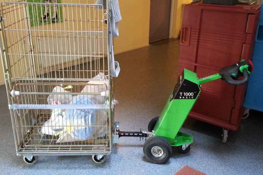 Ručně vedený elektrický tahač TT1000-T-Basic slouží k manipulaci nákladu až do 1000 kg. Váží necelých 50 kg, je úzký a velmi skladný! Tahat může jakýkoliv vozík na kolečkách. Při zapojení získává tahač trakci přímo z břemene. Tahač se zahákne zespodu za vozík a hákem se o vozík zapře. Nejlépe je to vidět na videu. Hák může být různý – mechanický na míru vozíku, anebo plně elektrický. S výběrem háku poradíme.