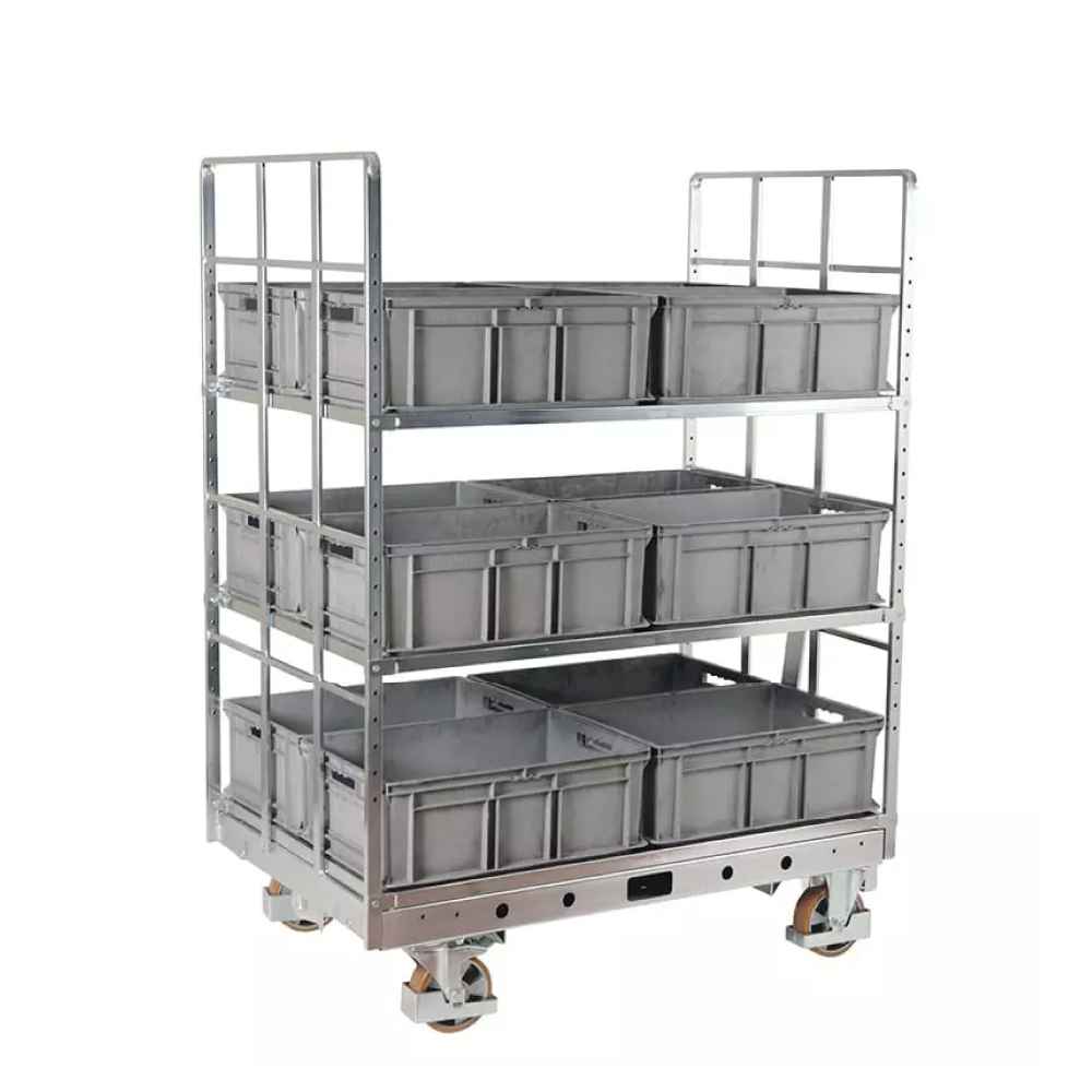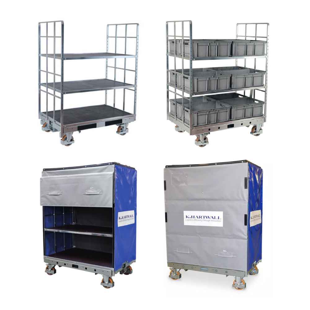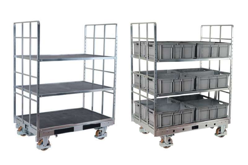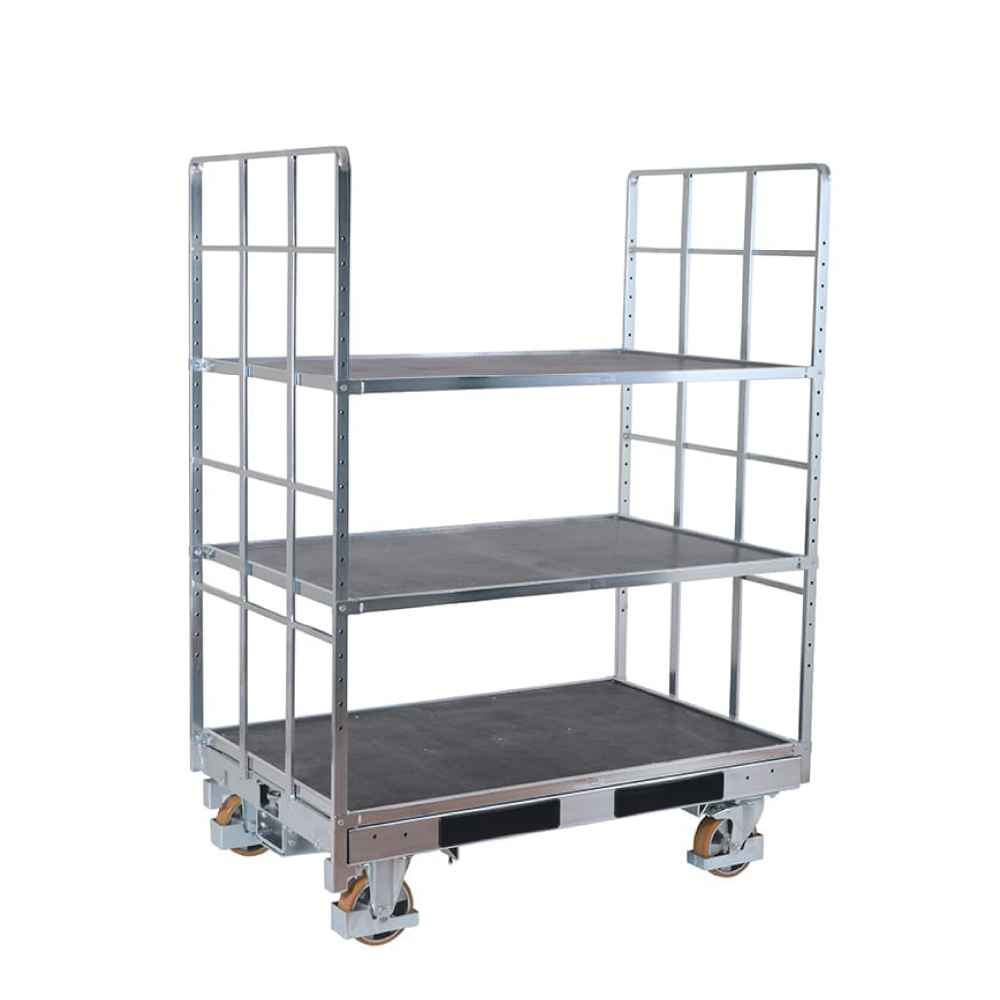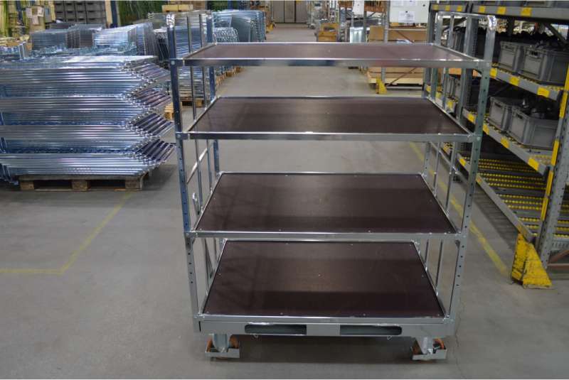Policový přepravní vozík Shelf Wagon slouží především pro přepravu KLT boxů a přepravek do celkové hmotnosti až 450 kg. Jedno patro má nosnost 150 kg a výška polic je snadno nastavitelná. Vozík může mít až 4 police při dodržení celkové nosnosti 450 kg. Tažná oj je výsuvná a díky kompatibilitě s ostatními vozíky můžete sestavit kombinovanou tažnou soupravu dle vlastních představ. V případě potřeby lze vozík snadno přestavět na plošinový vozík Pallet Size Dolly a využít jej např. pro převoz celých palet!